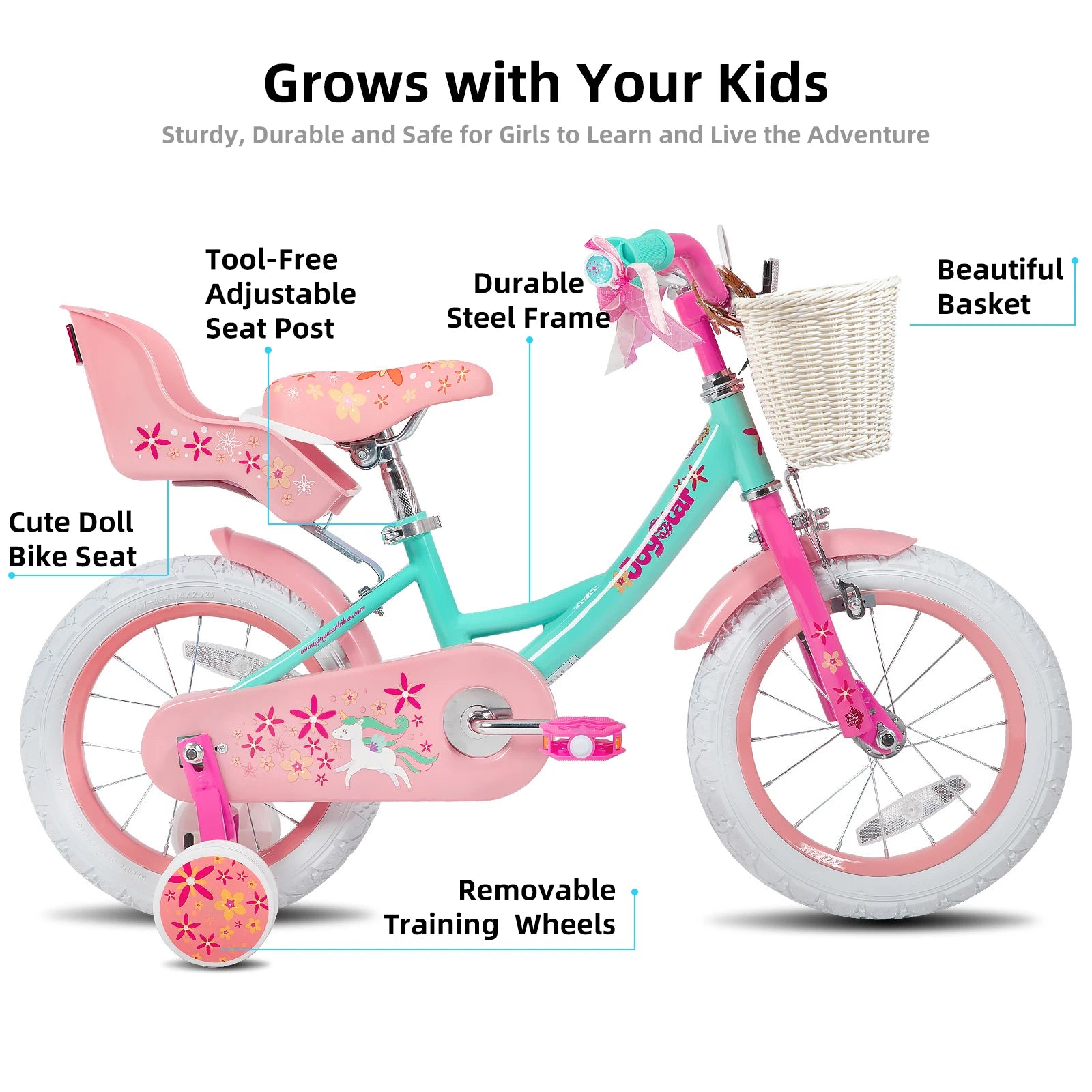 JOYSTAR Kids Bike for Girls Age 2-9 Years, 12 14 16 18 Inch Kids Bike with Training Wheels, Doll Seat, Streamers, Basket, Green