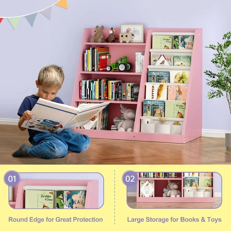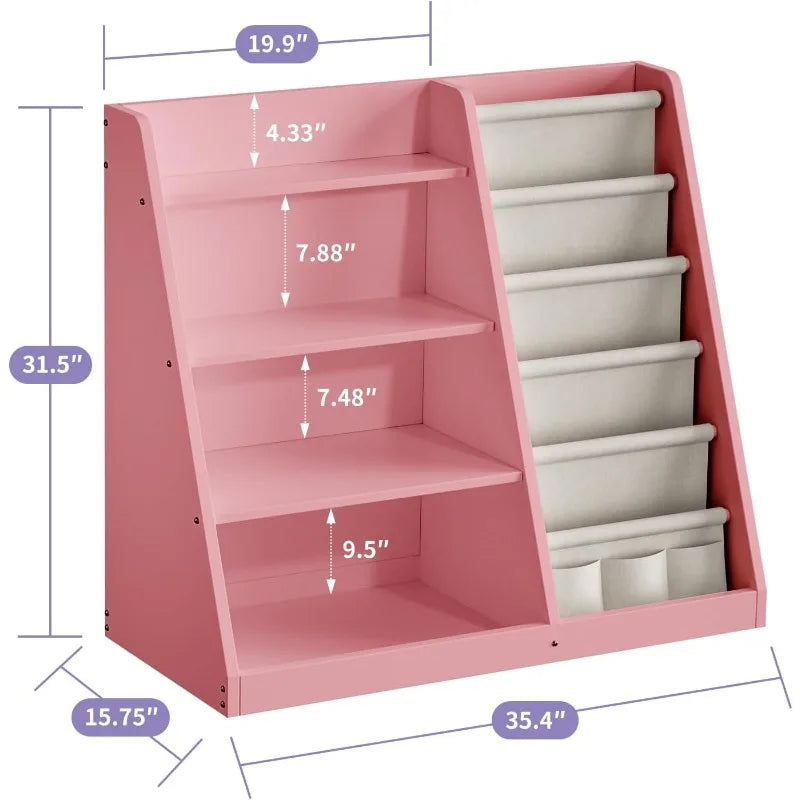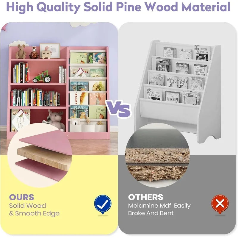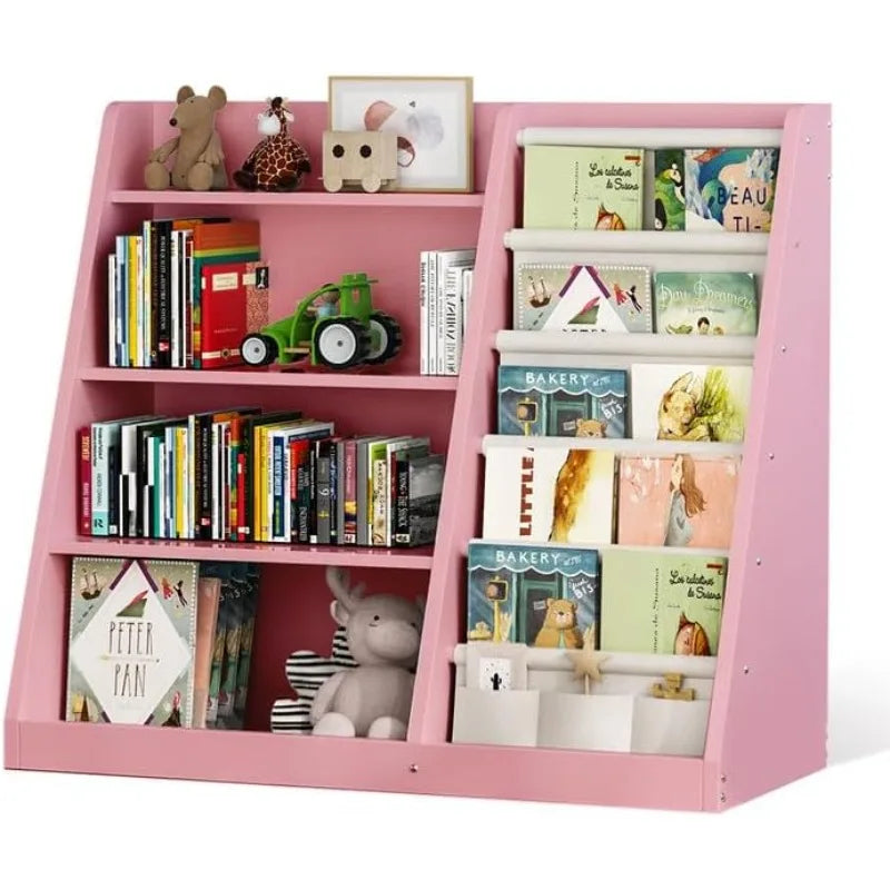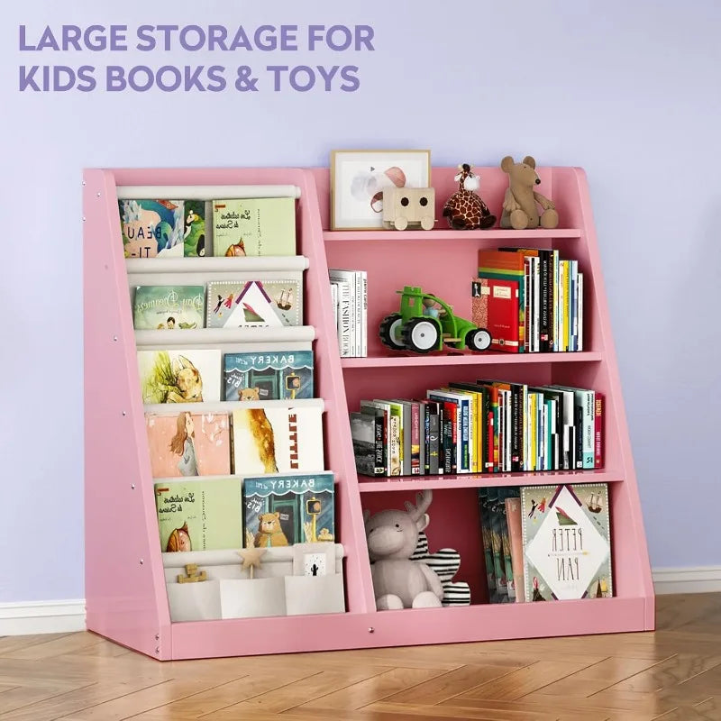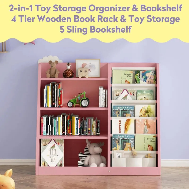 Kids Bookshelf and Toy Storage Organizer, 4 Tier Wooden Kids Book Shelf with Sling Book Rack in Kids Room Playroom Nursery