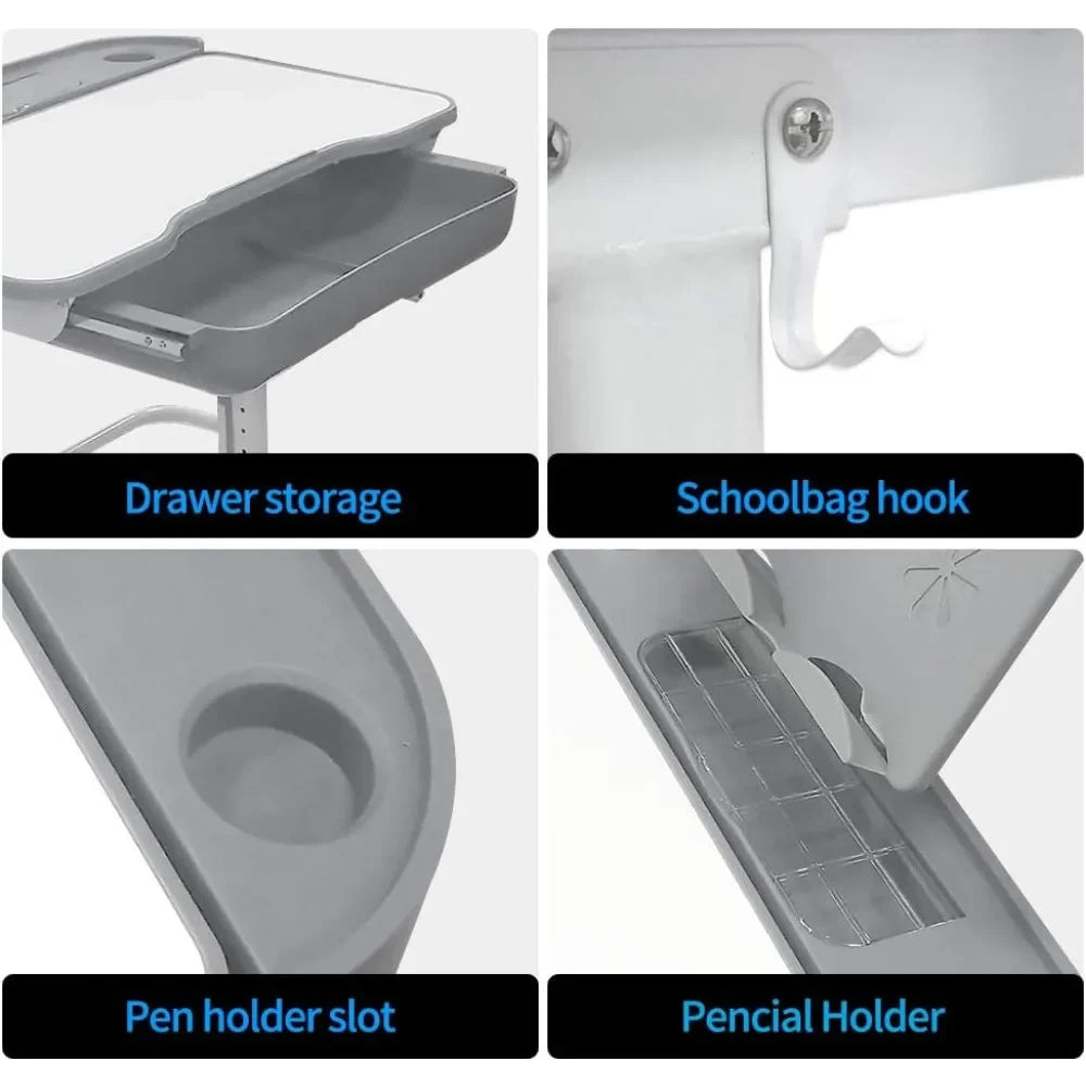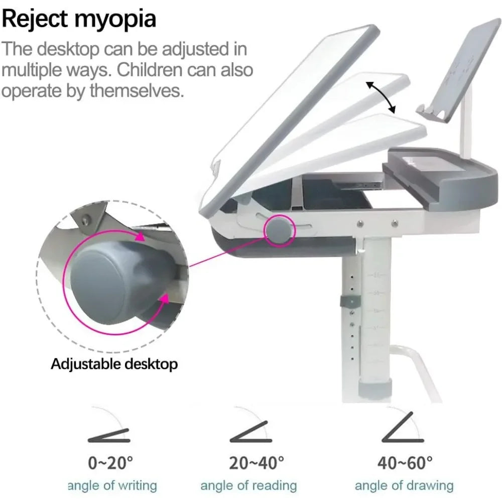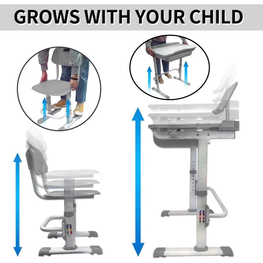 Kids Desk and Chair Set, Children School Study Desk with Tilt Desktop, Bookstand, LED Lamp, for Boys Girls, (Grey)