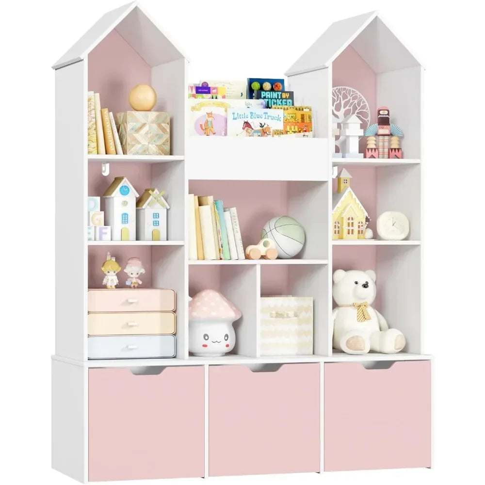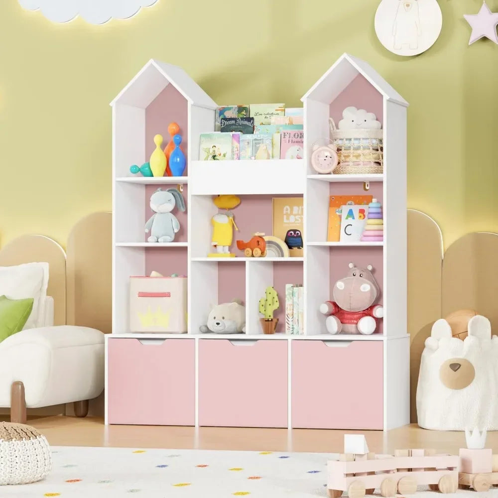 Toy Storage Organizer with Castle RoofLarge Kids Bookshelf Dollhouse with 3 Movable Drawers and 9 Storage Cubbies Toy Organizers